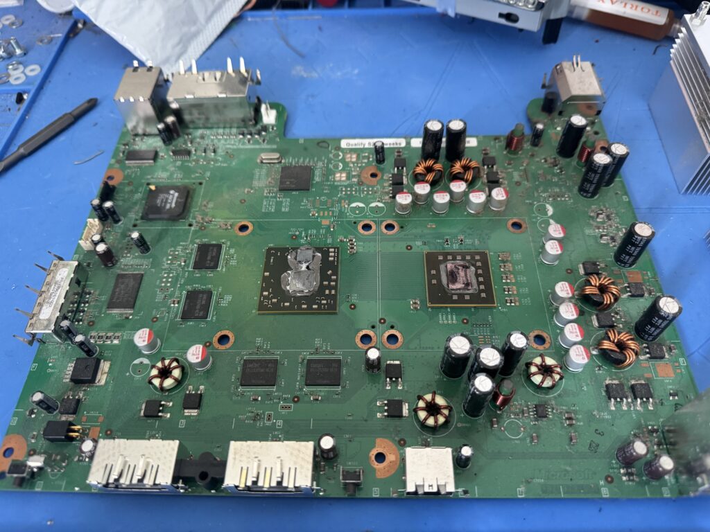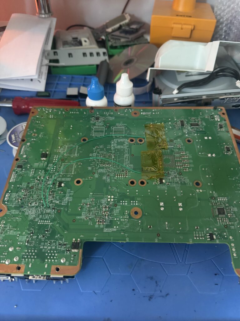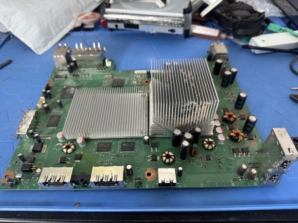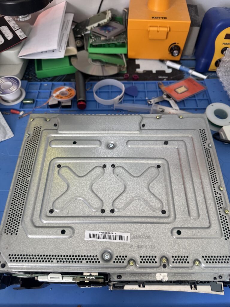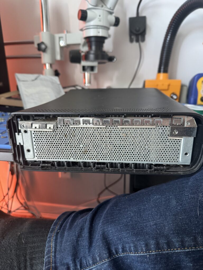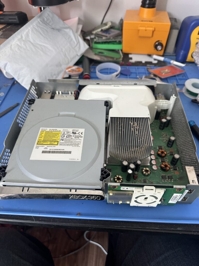 We’ve got to remove the DVD drive and the RF / power board on the front, and then we can get at the logic board itself after we lift it out of the shell. Then the real mad science can begin…