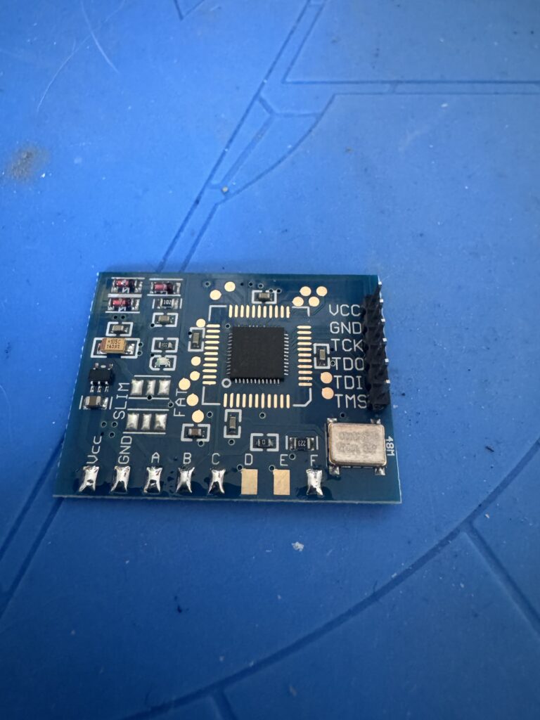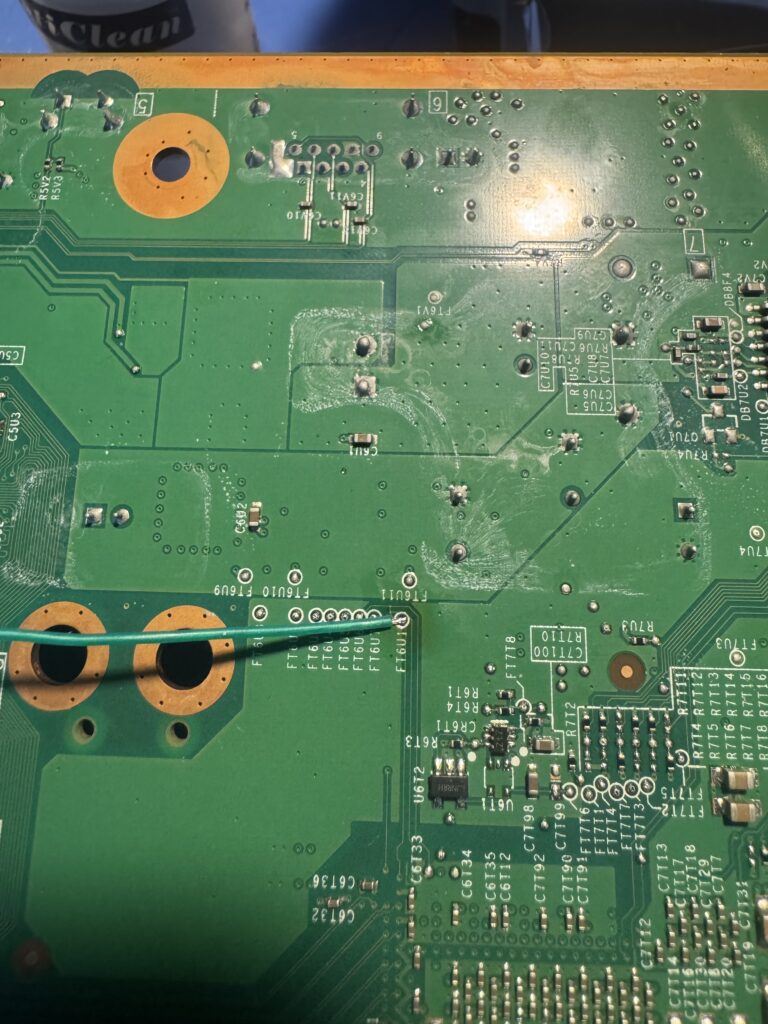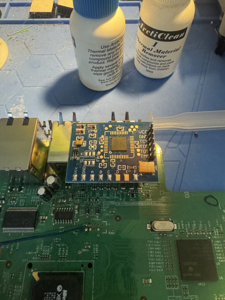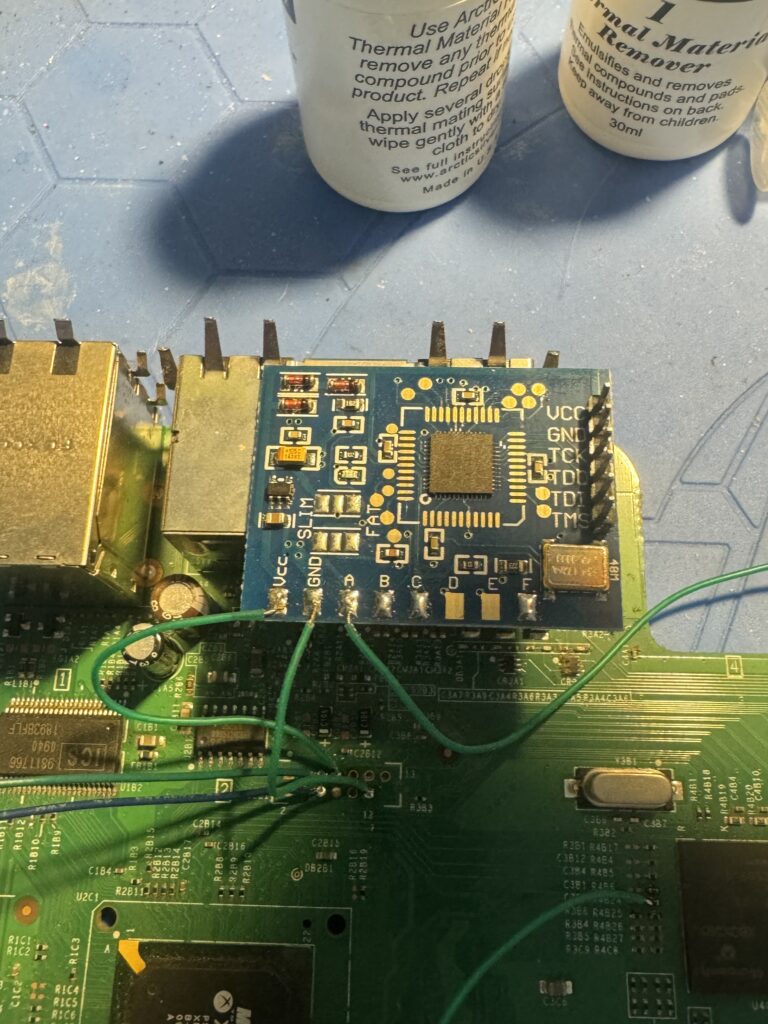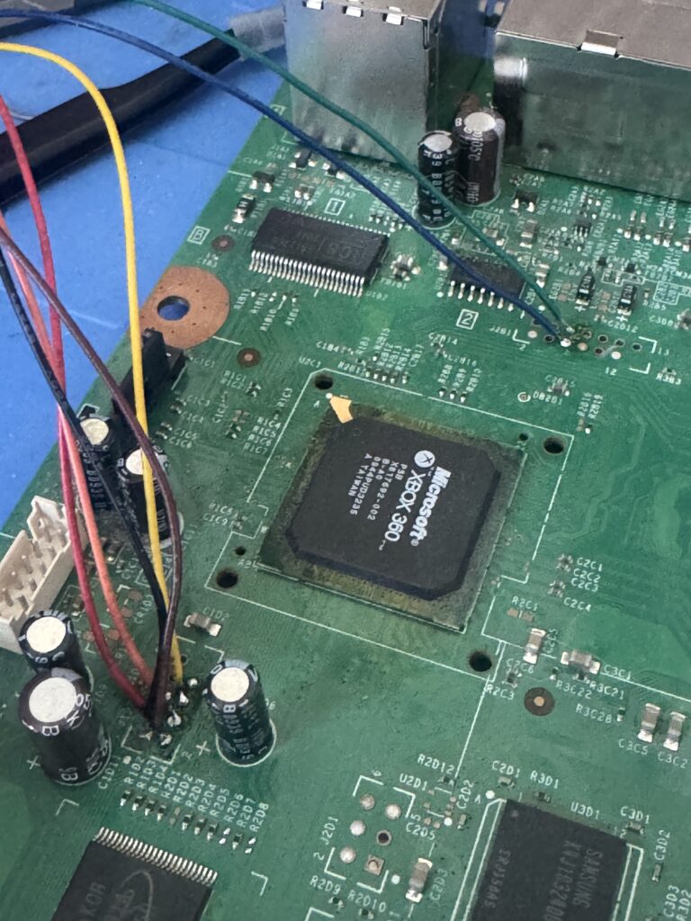Now that we’ve got the NAND dumps, let’s take a look at our Matrix chip. The technical info on the timing exploits used is pretty mindboggling. After some more reading, we don’t need the onboard crystal oscillator so we can remove the 0 Ohm resistor just above the D and E pads, effectively “converting” it into a v1 chip. Don’t forget to also bridge the SLIM or FAT pads above the ground and A pads in the bottom left depending on what console type is being glitched.