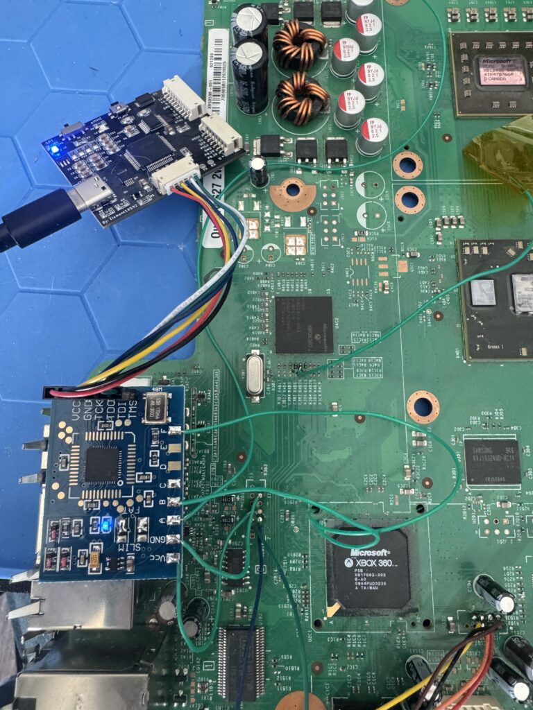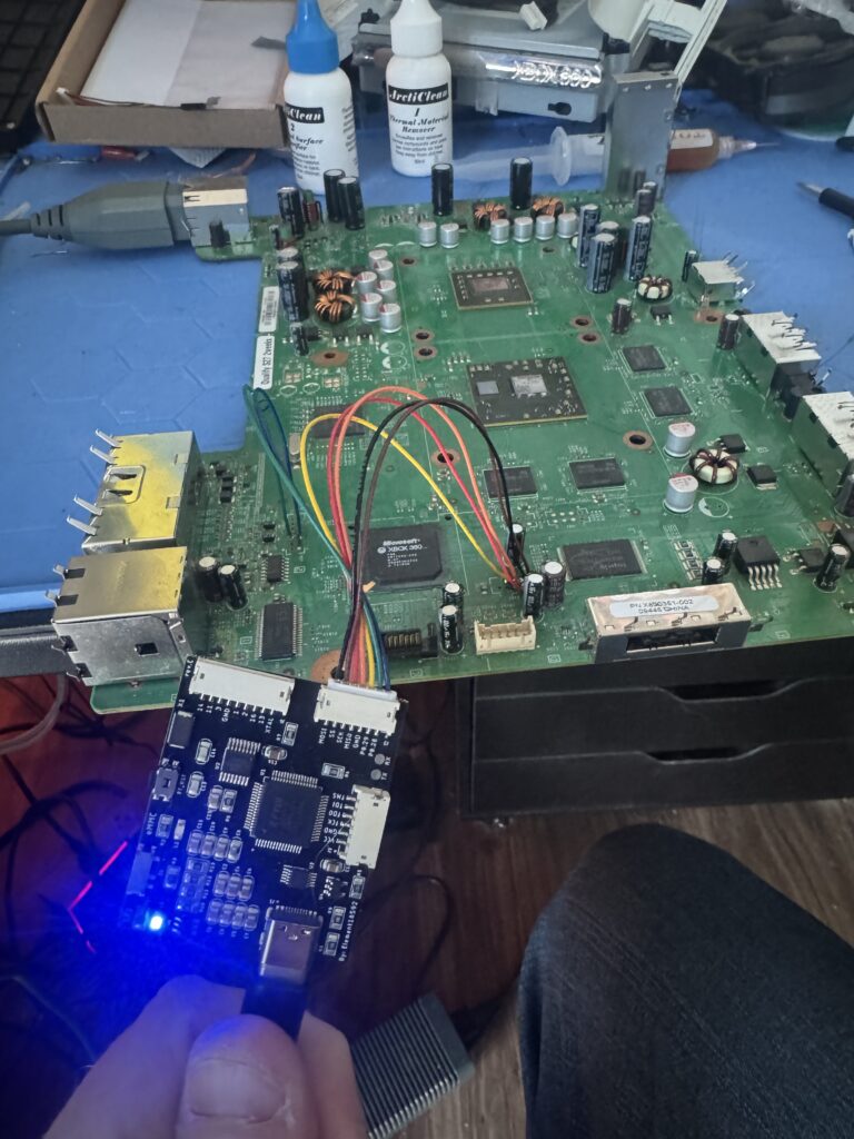 To read the contents we need to wire up some connections on the board. I snagged a USB-C XFlasher 360 for this as it can read NAND and program glitch chips. A Swiss army knife of 360 modding! It comes with the connectors, wires and everything you need to get your NAND data after some quick soldering.