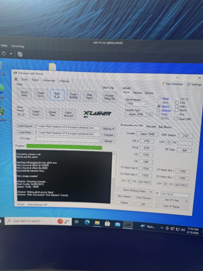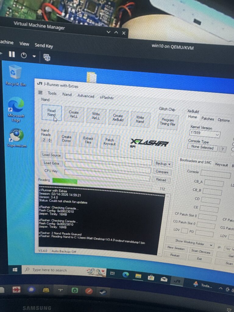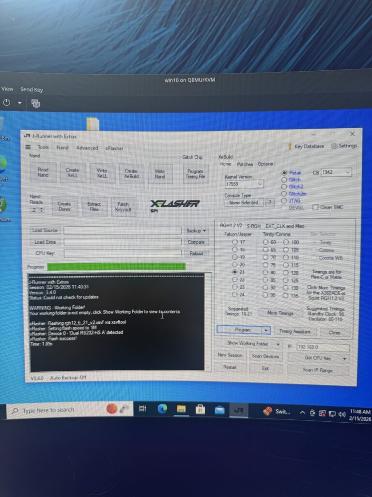 With that all out of the way we can hook up the flasher to a Windows PC and do what we need to do. J-Runner with extras has all the goods you need! Because I’m a turbo-nerd I ditched Windows last year and use CachyOS as my daily driver now, so a Win10 VM was created for this work. Works perfectly with USB passthrough – genuinely impressive!
